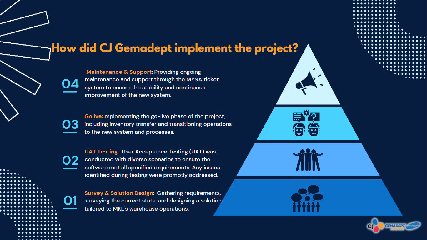 • Phase 1 – Survey & Solution Design: Gathering requirements, surveying the current state, and designing a solution tailored to MKL's warehouse operations.